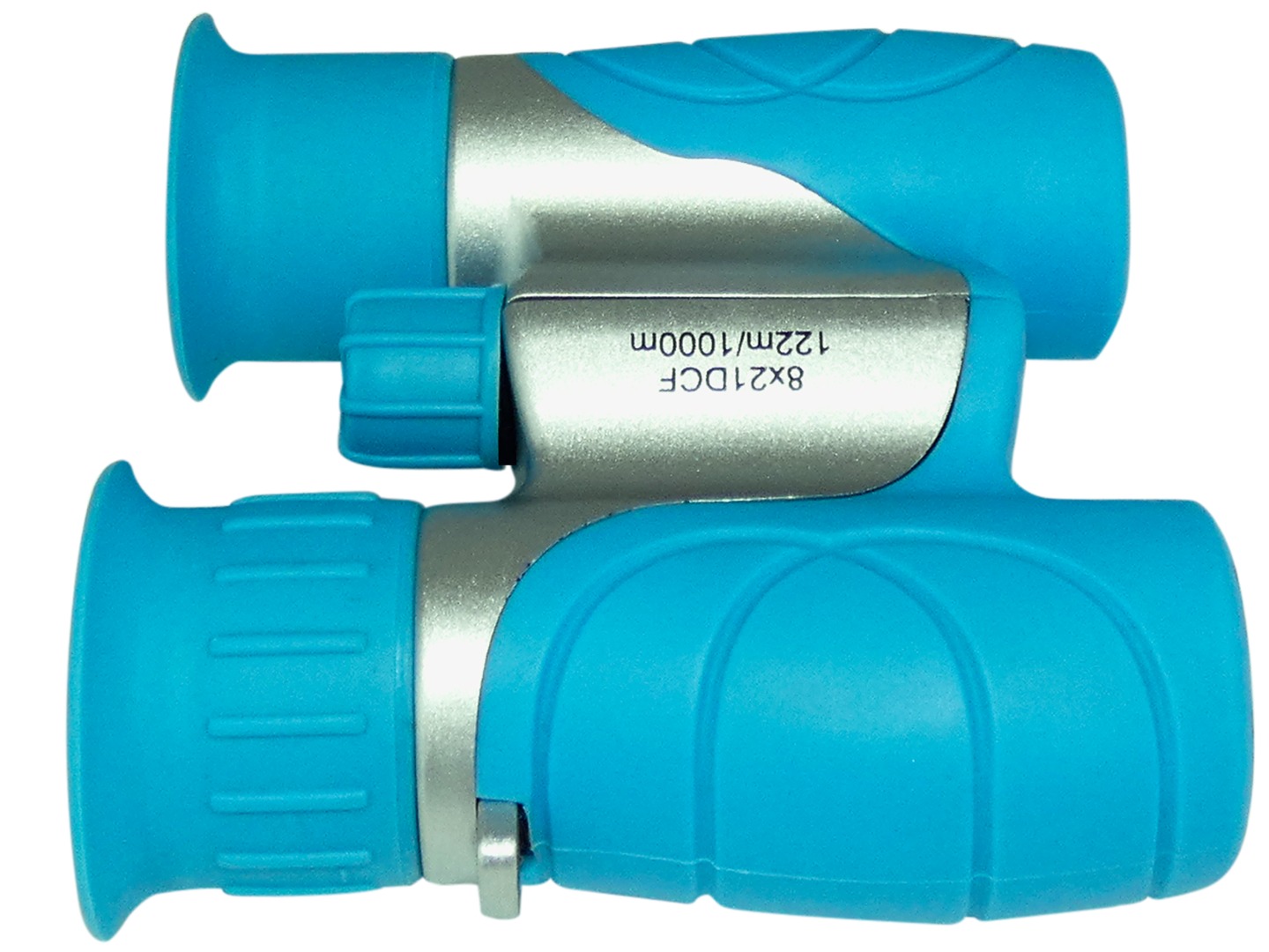 Advanced optics with 8x21 Magnification & 120/1000m Zoom, features safe and soft rubber eye pieces for child protection. Made small enough for little hands to hold with easy to adjust, simple to use focus knob. Engineered with durable shock-resistant material for all your child's fun adventures. Includes Carrying Case, Wrist Strap and Optical Cleaning Cloth. Color: Blue & Silver
