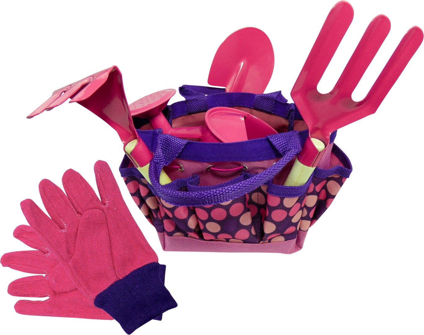 Eagle Eye Explorer 7 piece all-in-one toy kit strong for all season outdoor and backyard games & activities. Lightweight 8" trowel, 3 prong raking hoe & pitchfork tools, made real-life garden & nature exploration. Matching 4.5" pitcher with handle & spout to carry & pour water. Sturdy 8" organizer bag to hold & organize tools, accessories, seeds, & toys. Thick heavy-duty cloth gloves to protect children's hands. For children ages 4 years old and up. Pink